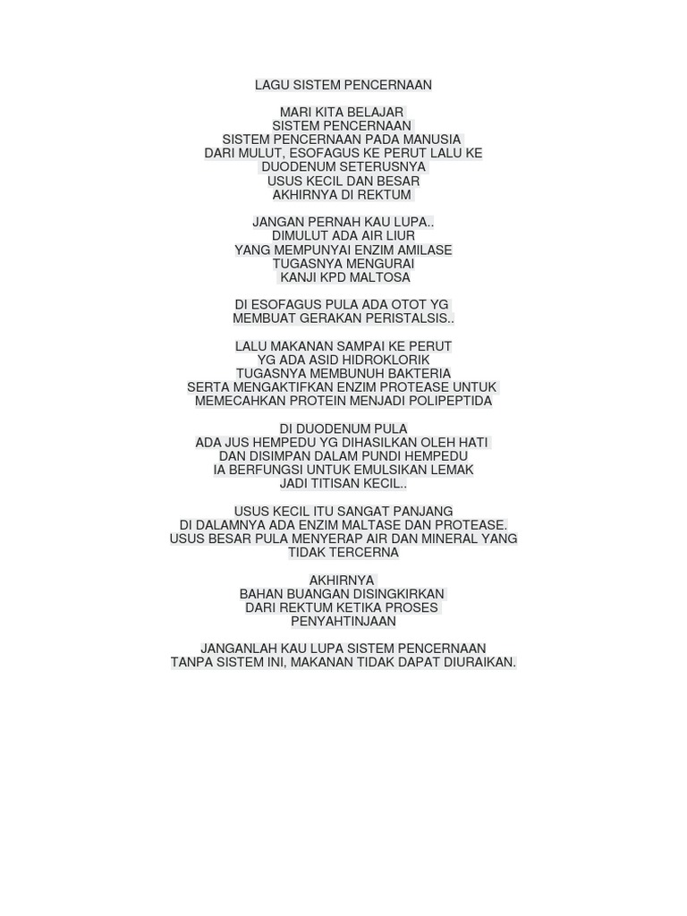 Project Menyanyikan lagu menanam jagung dengan menggunakan lirik seperti vidio yang telah dibuat dan silahkan untuk direkam dalam bentuk vidiosemoga vidio. Sistem Pencernaan Manusia dimulai dari Proses memasukan makanan ke dalam mulut Injesti Proses mengubah makanan menjadi kecil dan lembut dikunyah oleh gigi Pencernaan mekanik Proses mengubah molekul makanan kompleks menjadi sederehana oleh enzim asam bile dan air Pencernaan Kimiawi. Penyerapan Nutrisi dan Pembuangan Kotoran.
